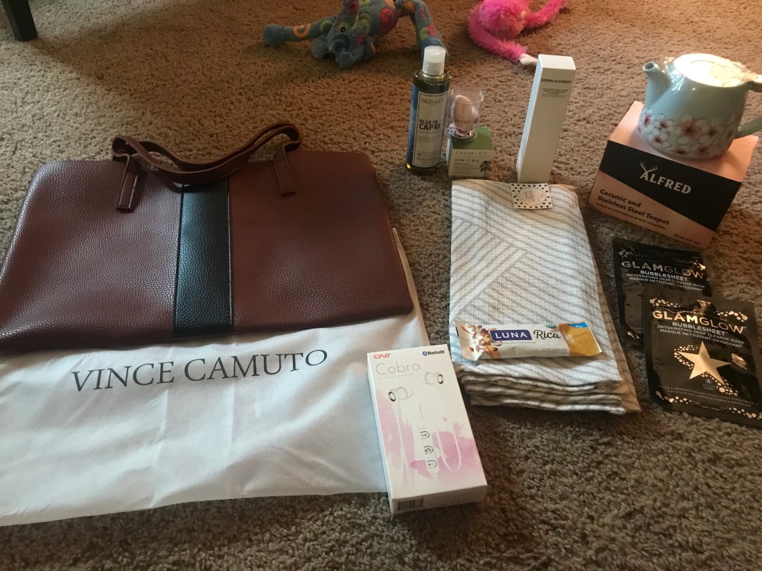 Next I opened my Fall FabFitFun box and ohhh my lord is it amazing!! AMAZING!! It came with two adorable hand towles for my kitchen, a cute little ceramic tea pot for steeping loose leaf tea, some beauty/bath products, wireless bluetooth headphones, a new Luna bar (already ate it and it’s delicious!!) and a gorgeous Vince Camuto vegan leather tote!! It’s a deep brown with black accents. 😍 I’m in love again! They give you the most amazing beauty products!! I received a shower gel by Skin&Co Roma- Blue in Capri with notes of Alpine Rose, Sage, Wild Basil and Autumn Blossom. I know which shower gel I’m using next! 🛀 I also received 2 individual Glamglow Bubblesheet oxygenating deep cleanse mask, a beautyblender for contouring, Grown Alchemist Hydra-repair day cream for my face, and Farmacy Dew It All total eye cream! I’m in beauty heaven, seriously.