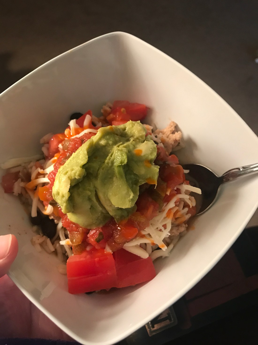 Dinner tonight is a Southwest Ground Chicken burrito bowl! My lord this is delectable!!! I cooked my rice while I browned the ground chicken with some onion. Then, while the rice was finishing up I added a little organic vegetable broth, black beans, diced tomato, chili powder and cumin to the dish. When that was heating up I added the finished rice, mixed together and let it heat for a few minutes longer. Then serve in a bowl topped with cheese, salsa and guac! π Delish!!