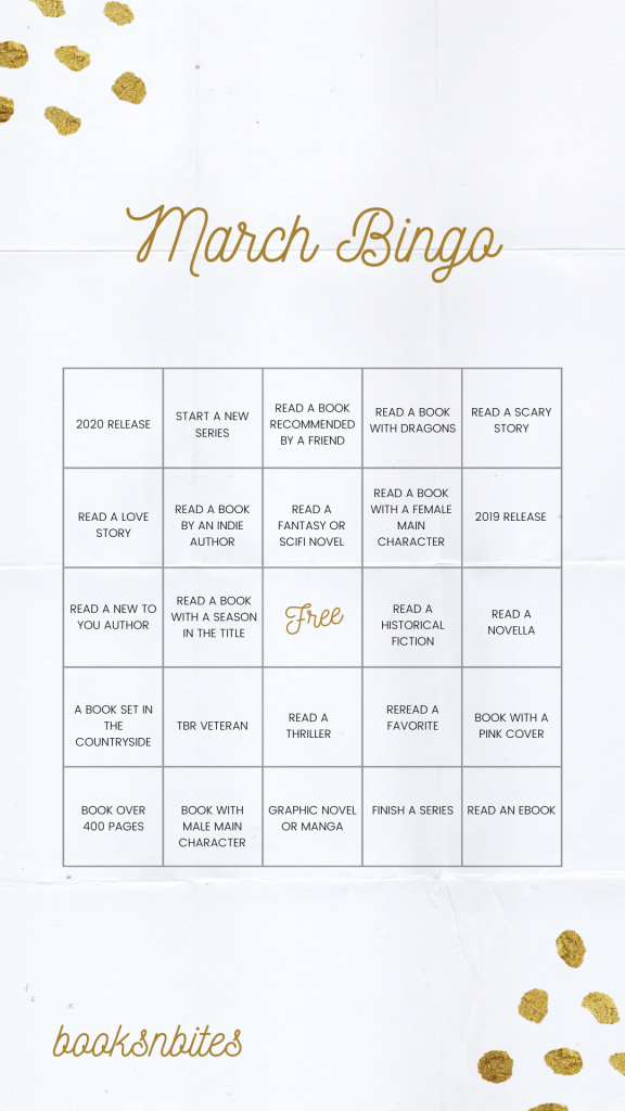That makes a total of 14 books I am planning on reading for March. It’s not too big of a goal, I’ve read more than that before. I just need to stay focused and on track!! That is why I created a Book Bingo board for myself, and any of you are absolutely welcome to join me!! I plan to post weekly updates for my Book Bingo board and TBR, so if you do decide to do the Bingo with me share your updates in the comments of my posts. ☺️